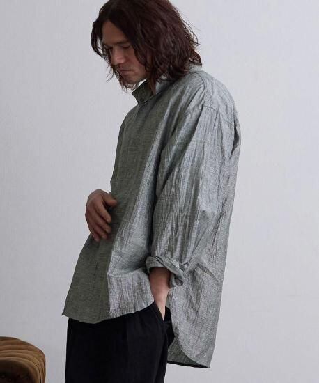 リネン特有の上品な光沢感と、ワッシャー加工による味のあるシワ感が絶妙なバランス、、、そんな素材で仕上がったおしゃれなシャツ。