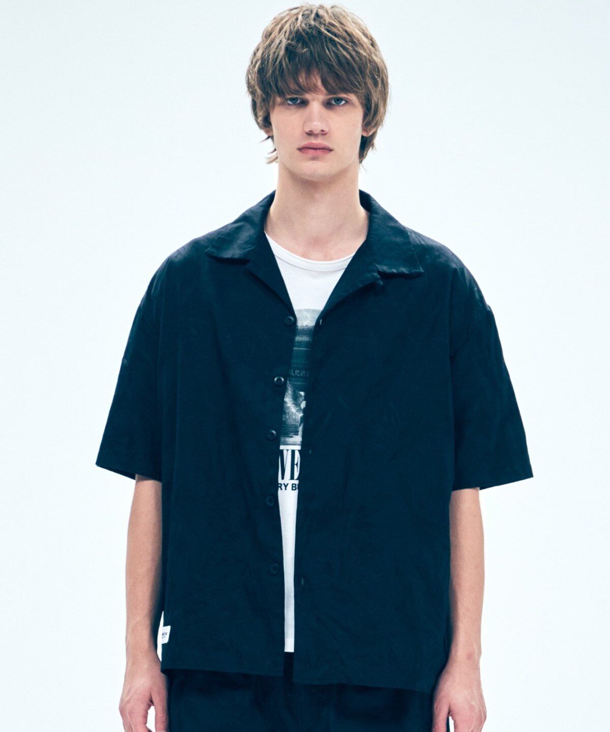 同系色の糸でジャガード編みを施し、ダークで美しい世界観を纏うアロハシャツ。