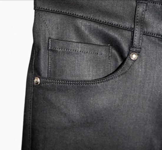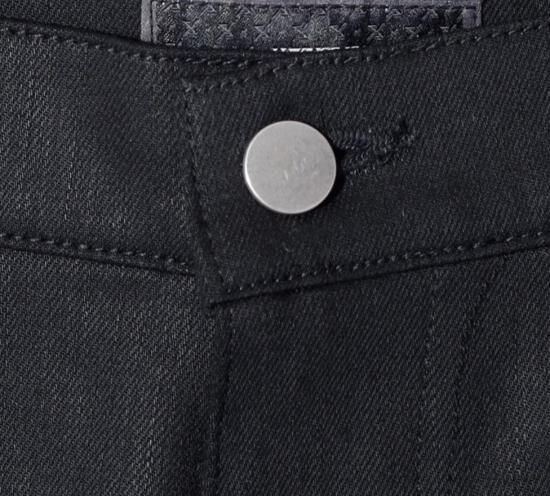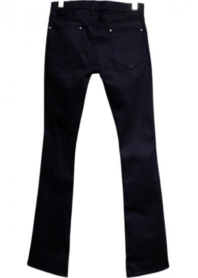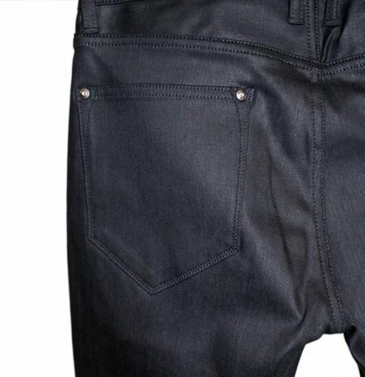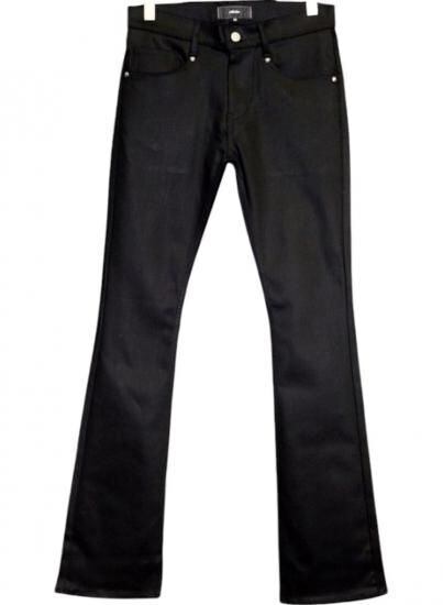 黒のポリエステルとポリウレタンを混紡した糸をスラブ糸で編みたて、よりツヤ感のあるキックバックの強いハイブリッドなストレッチデニムを使用したデニムパンツ。