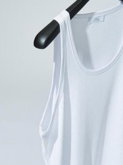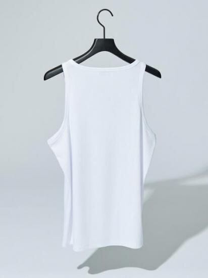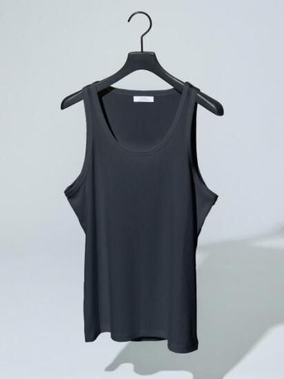衿ぐりの中心から袖山の付け根までを広く取り、抜け感を表現したリブタンクトップ。