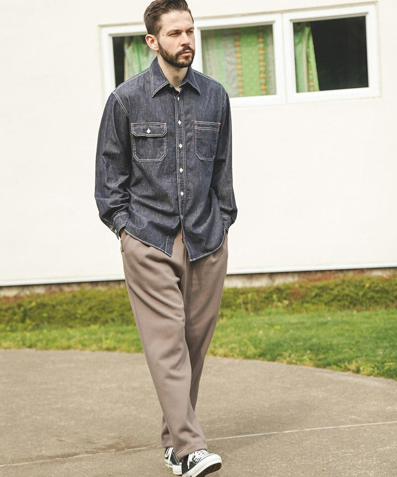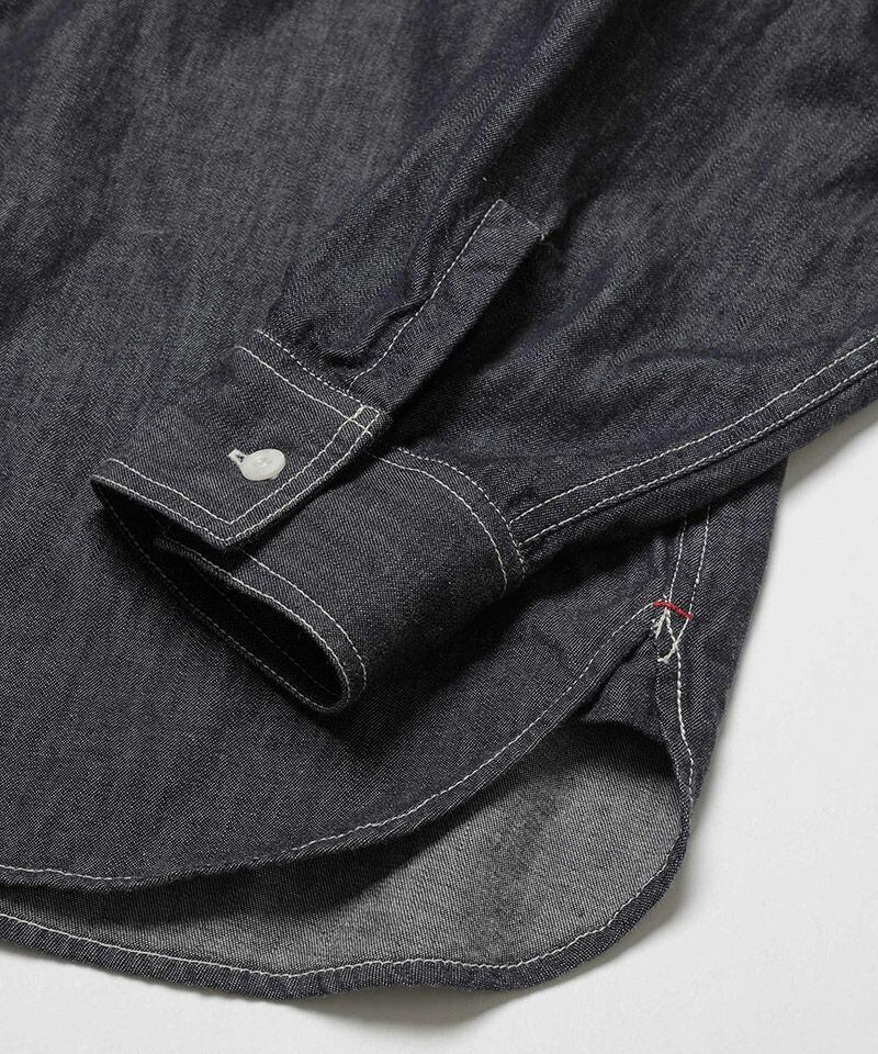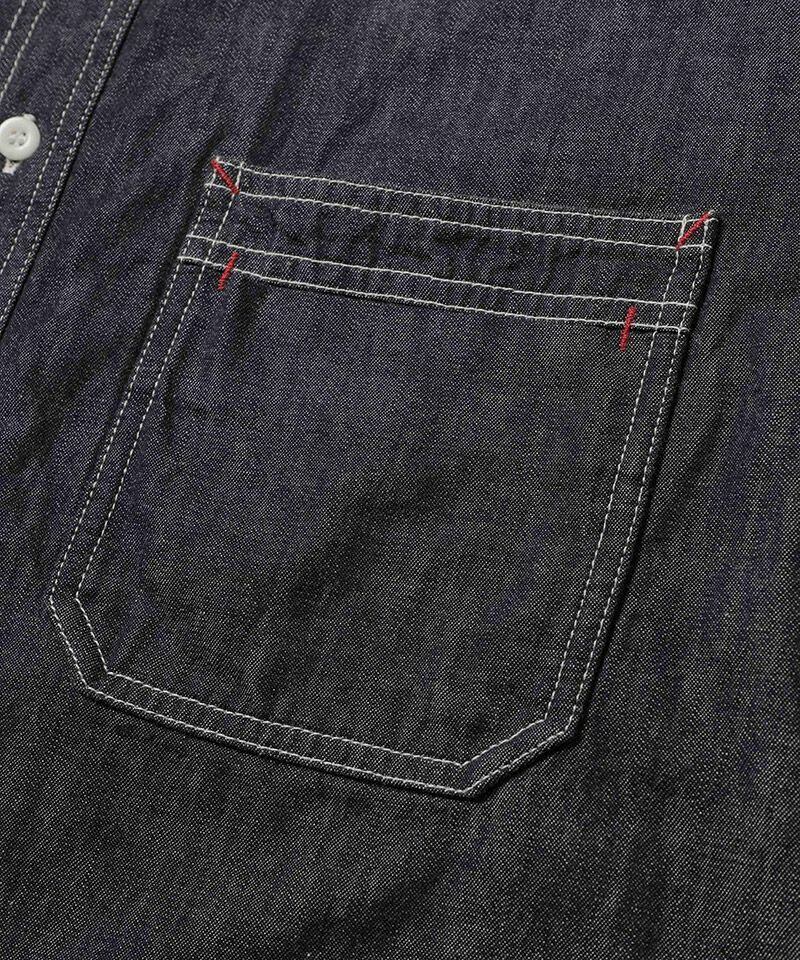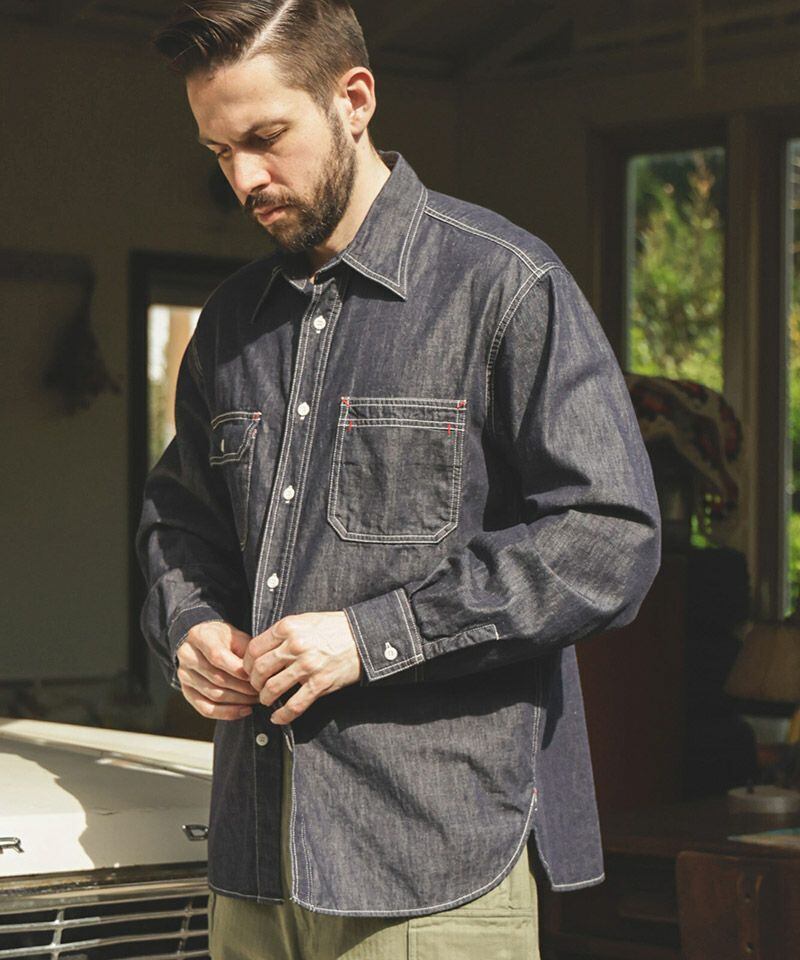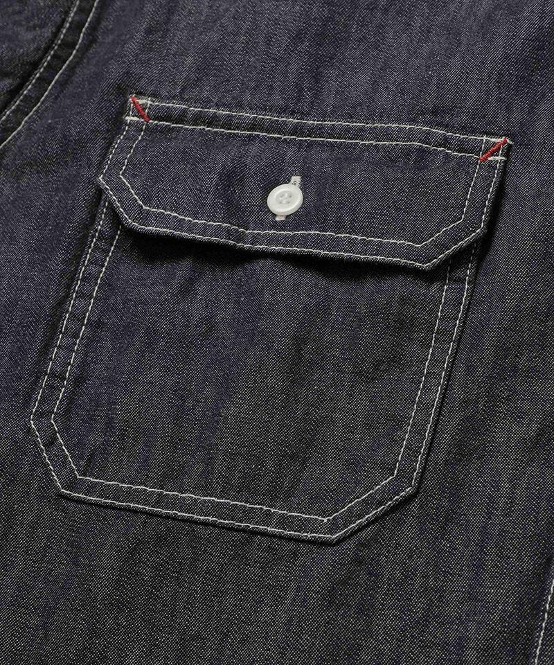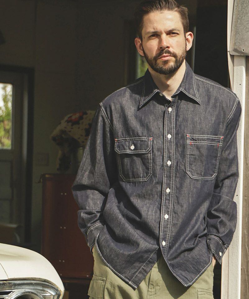 労働者の作業服として支給されていた、サービスマンシャツをベースにデザインし、白ステッチベースで補強部分は赤ステッチでアクセントに。