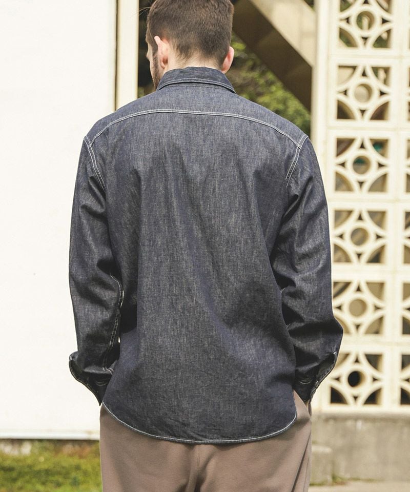 ムラ糸で織りあげたインディゴデニム生地を使用したデニムシャツ。