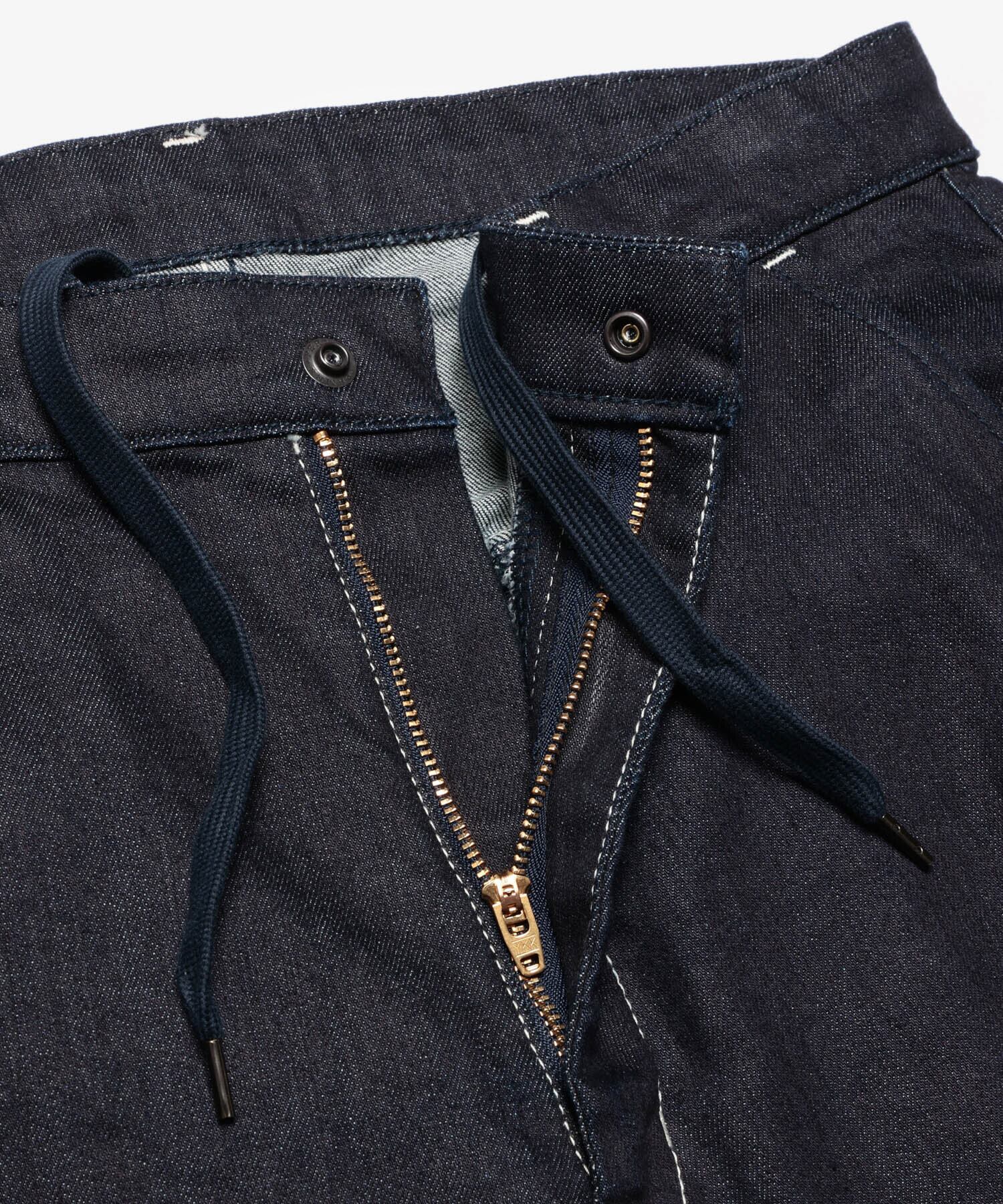 織の段階と洗い後の縮率により、ポリウレタン1%では通常なし得ない感動のスーパーストレッチを実現、かつ、綿99%なので男っぽい加工ツラも。