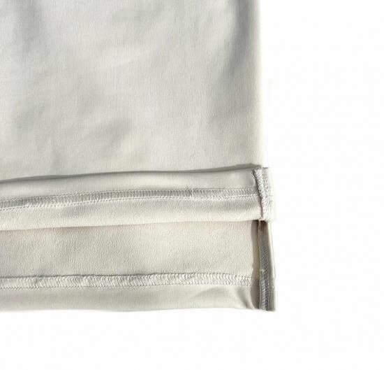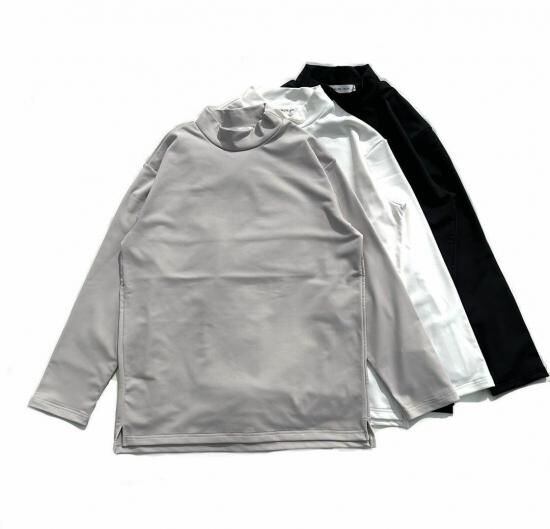 デザインは、袖口は筒口、サイドにはスリッド入り、ネック幅はハーフ丈の4.5cmモックネックに。