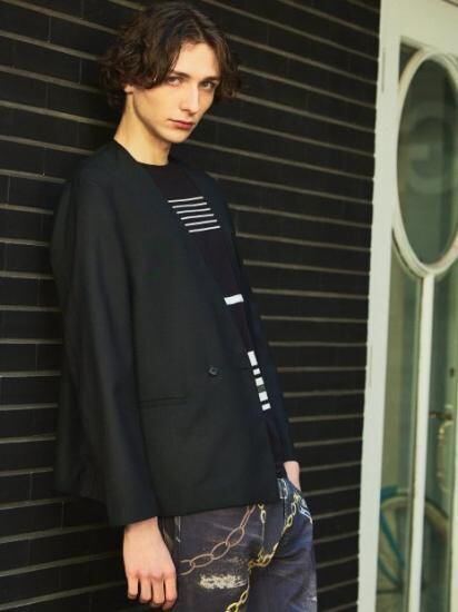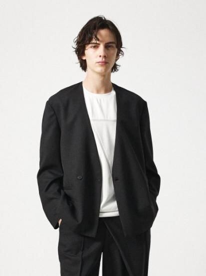 メインジャケット以外にも、ノーカラーを活かしたアウターインナーとしても活躍してくれるアイテムです。