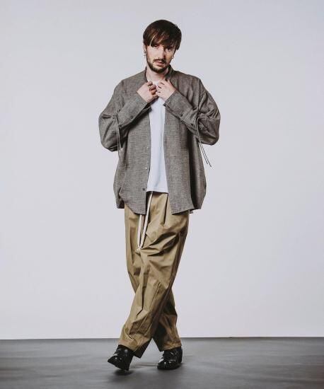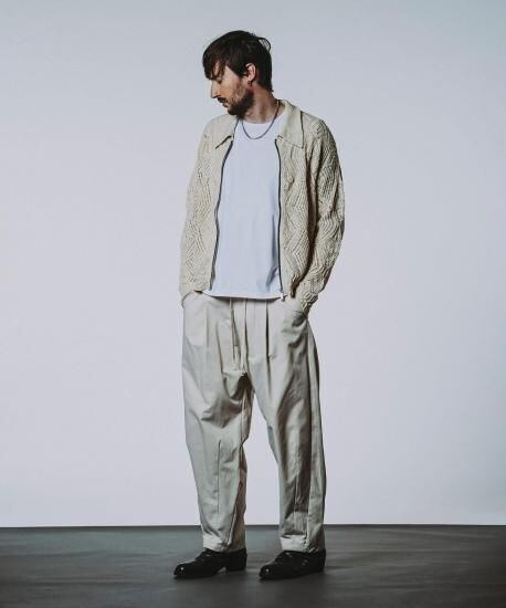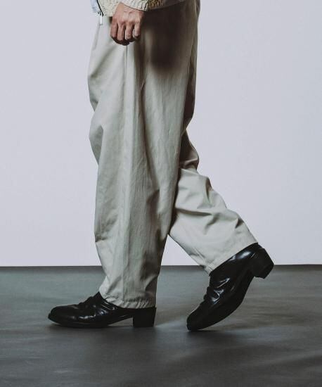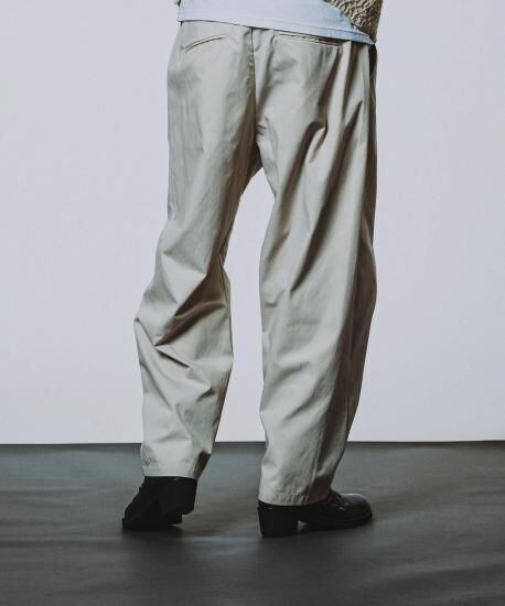 ポリエステルツイル素材を使用し、ボリューム感のあるふっくらとしたシルエットデザインに仕上げたワイドトラウザーズ。