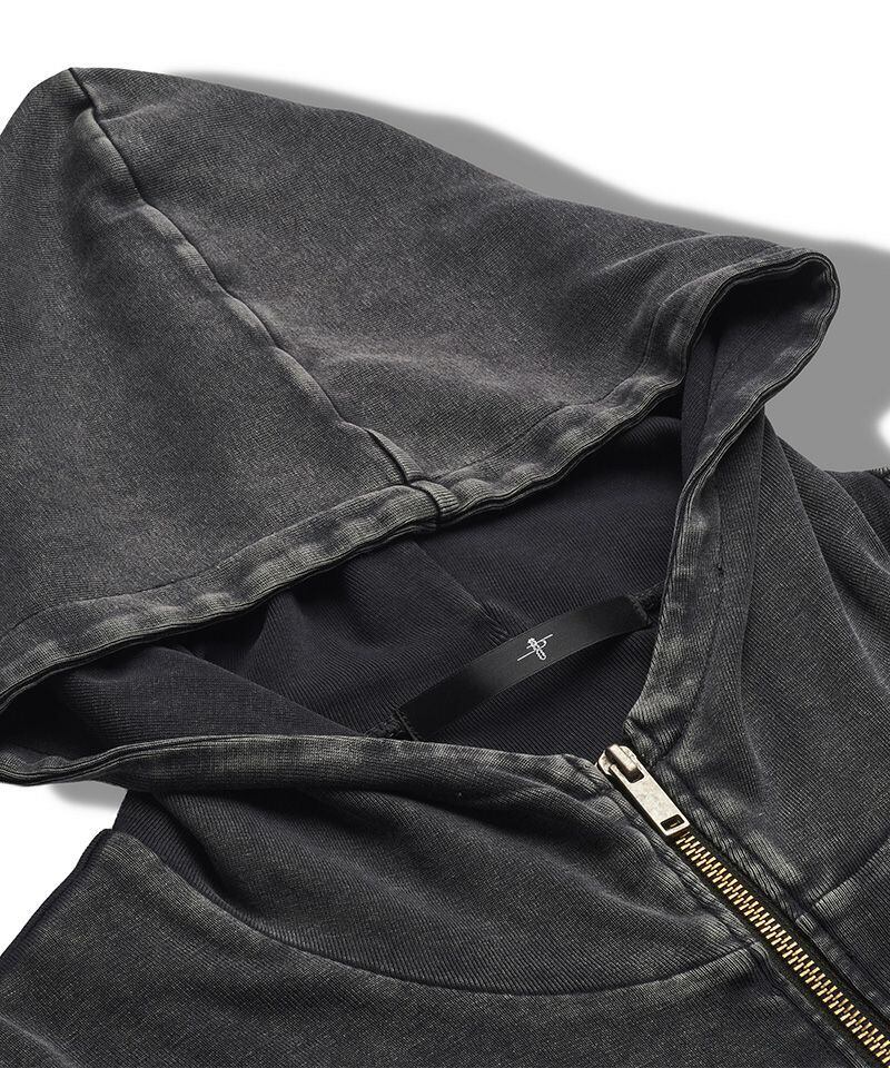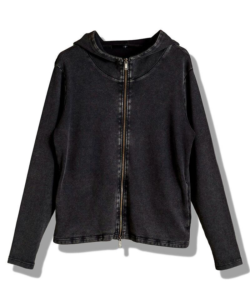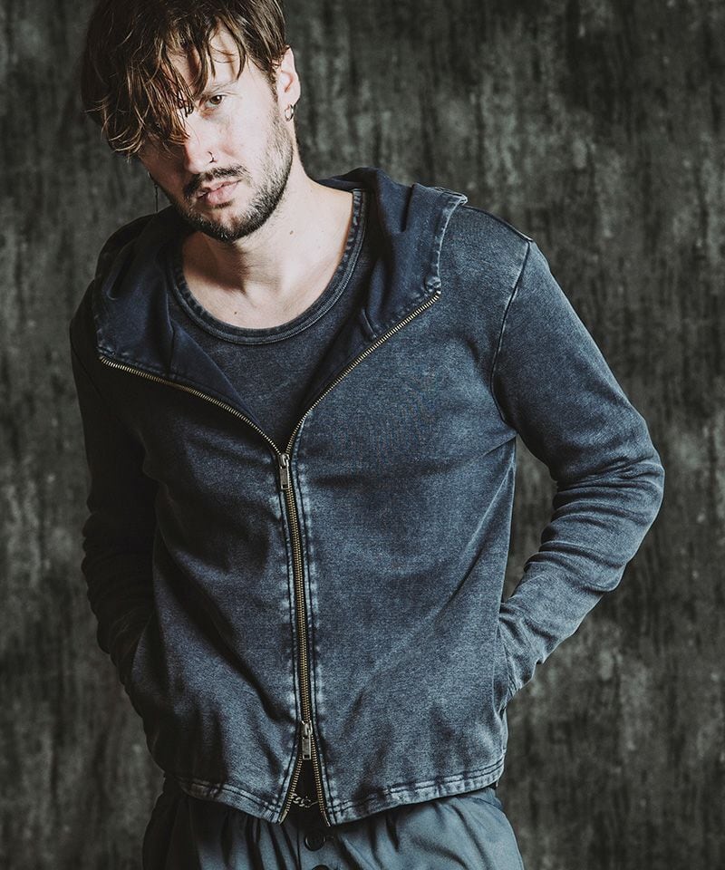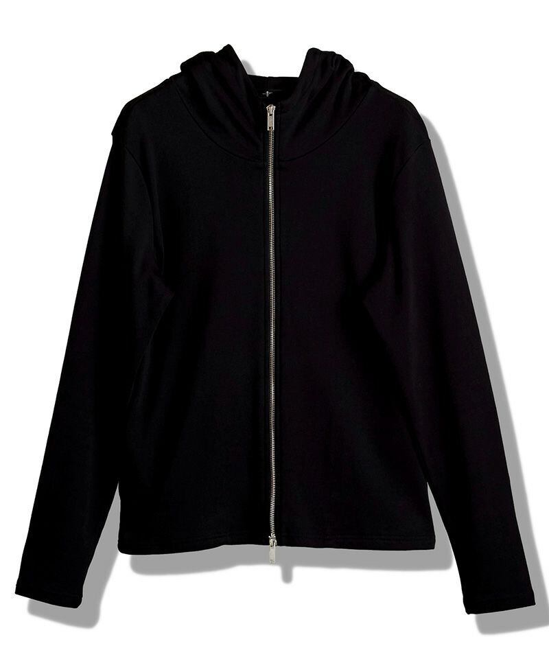 襟高なフードデザインと、スタイリッシュなシルエットが特徴の ZIPパーカー。