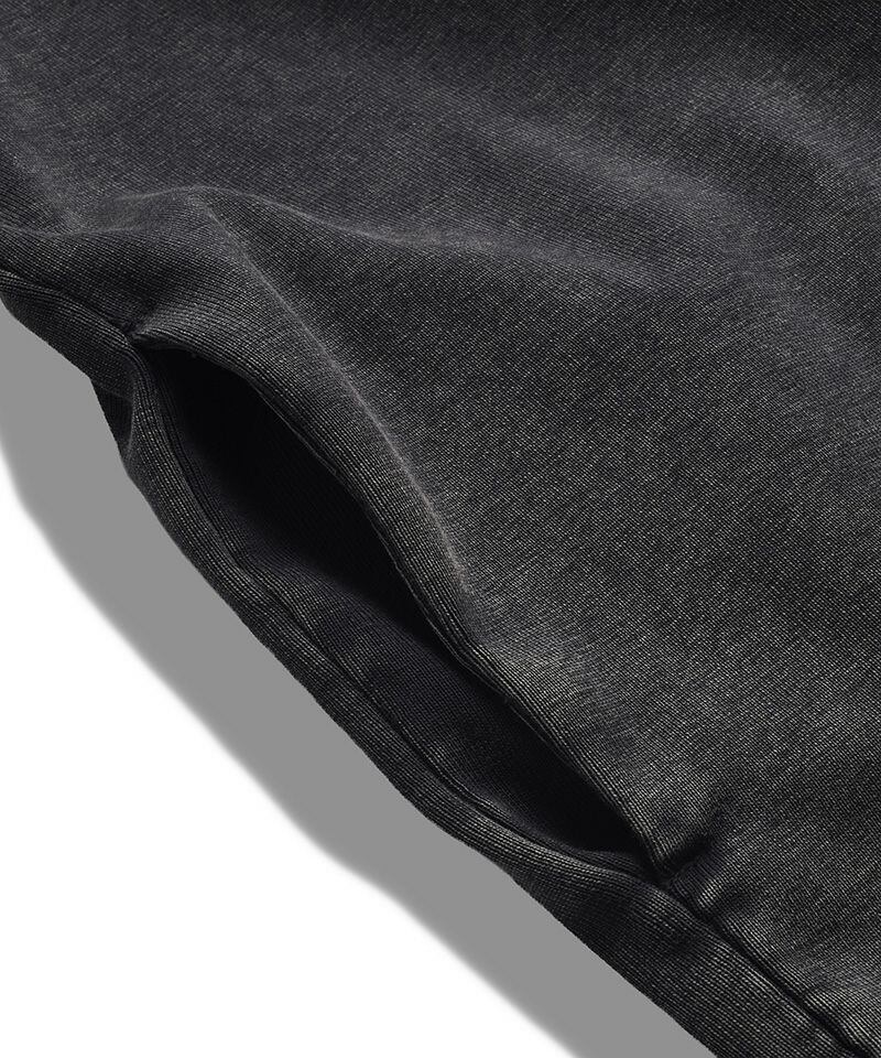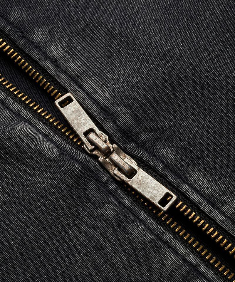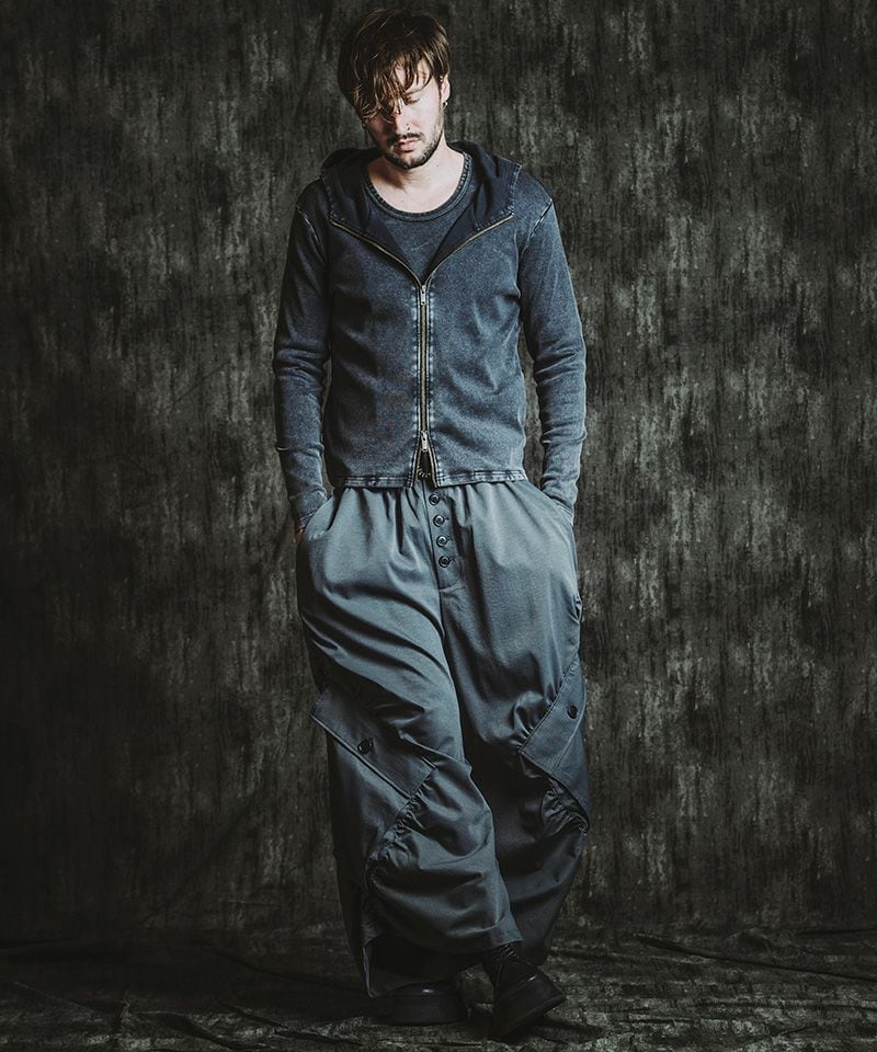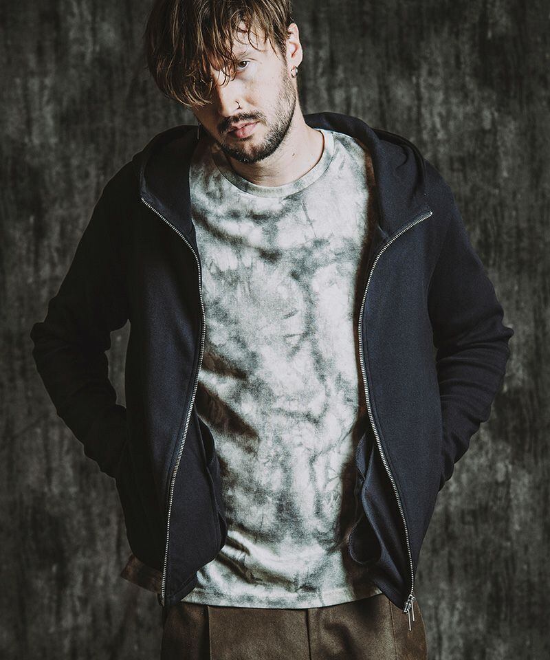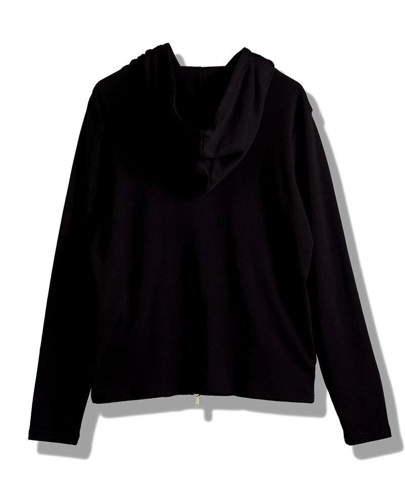 襟高なフードデザインと、スタイリッシュなシルエットが特徴の ZIPパーカー。