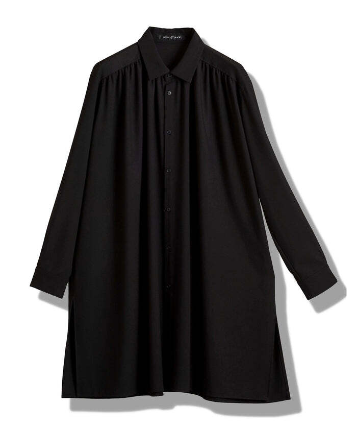 ロングシルエットとギャザーによる躍動感のあるロングシャツ。