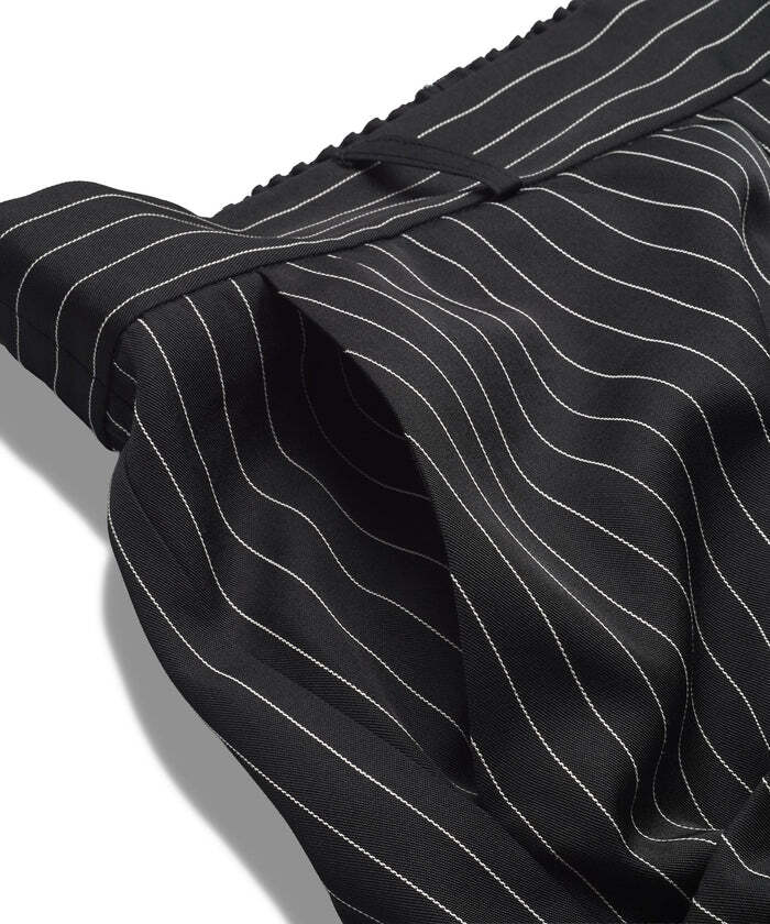 アシンメトリーデザインによる、不規則なフロントドレープが特徴のワイドトラウザーズ。