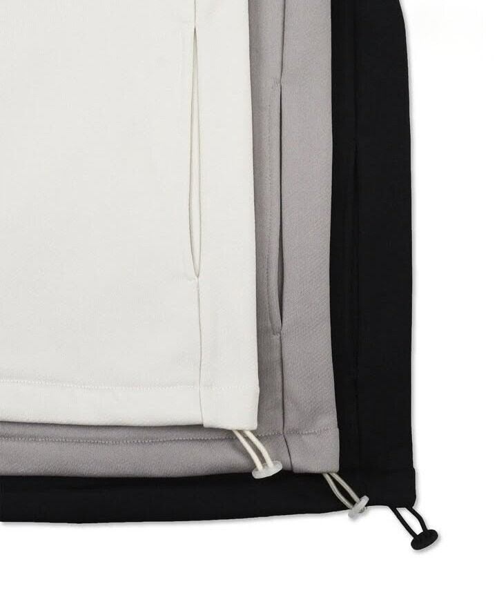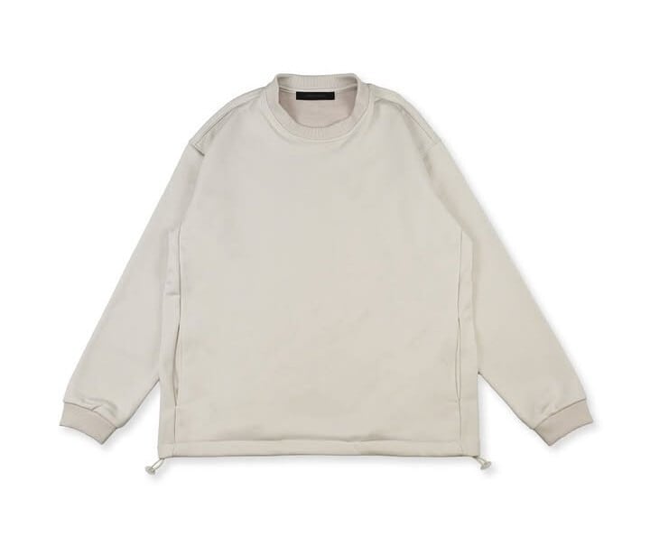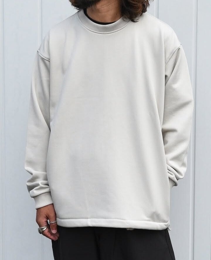 衿元と袖口はリブ仕様、裾には着丈調節できるスピンドル入りで、サイドシームポケット付きデザインで仕上がったスウェットです。