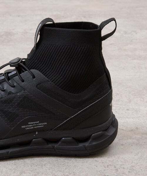 ハイカット部分にはニット素材を使用し、履き心地も良く、履き口周りからの浸水も防止できるデザイン。