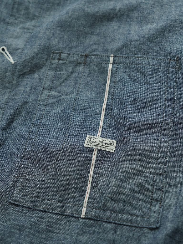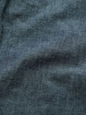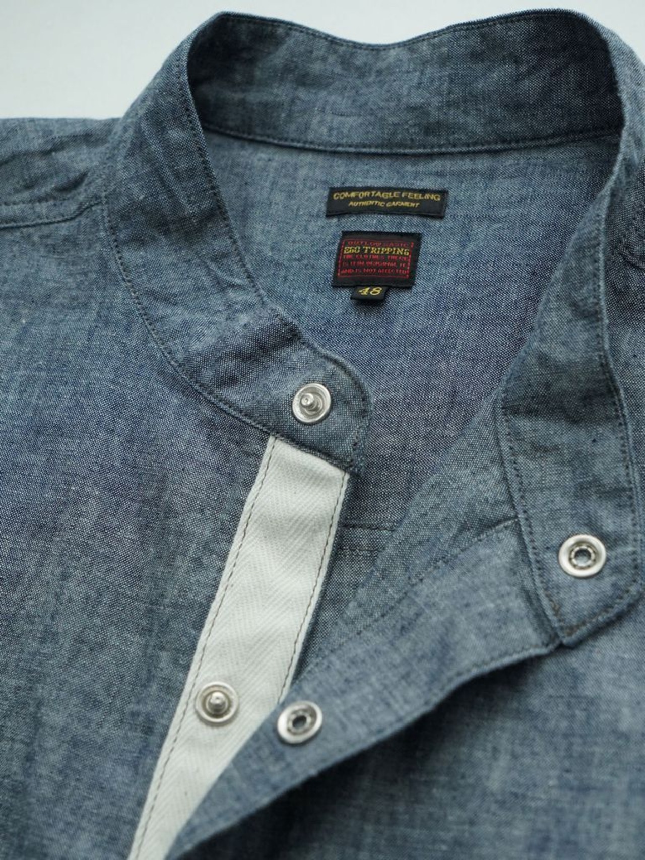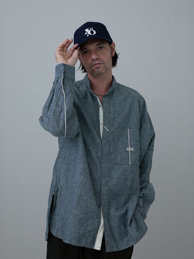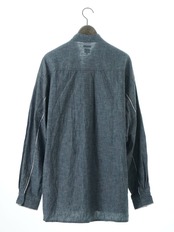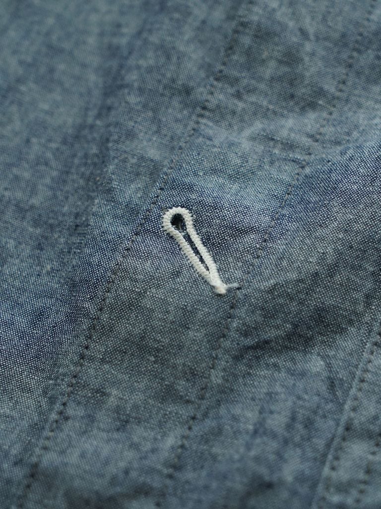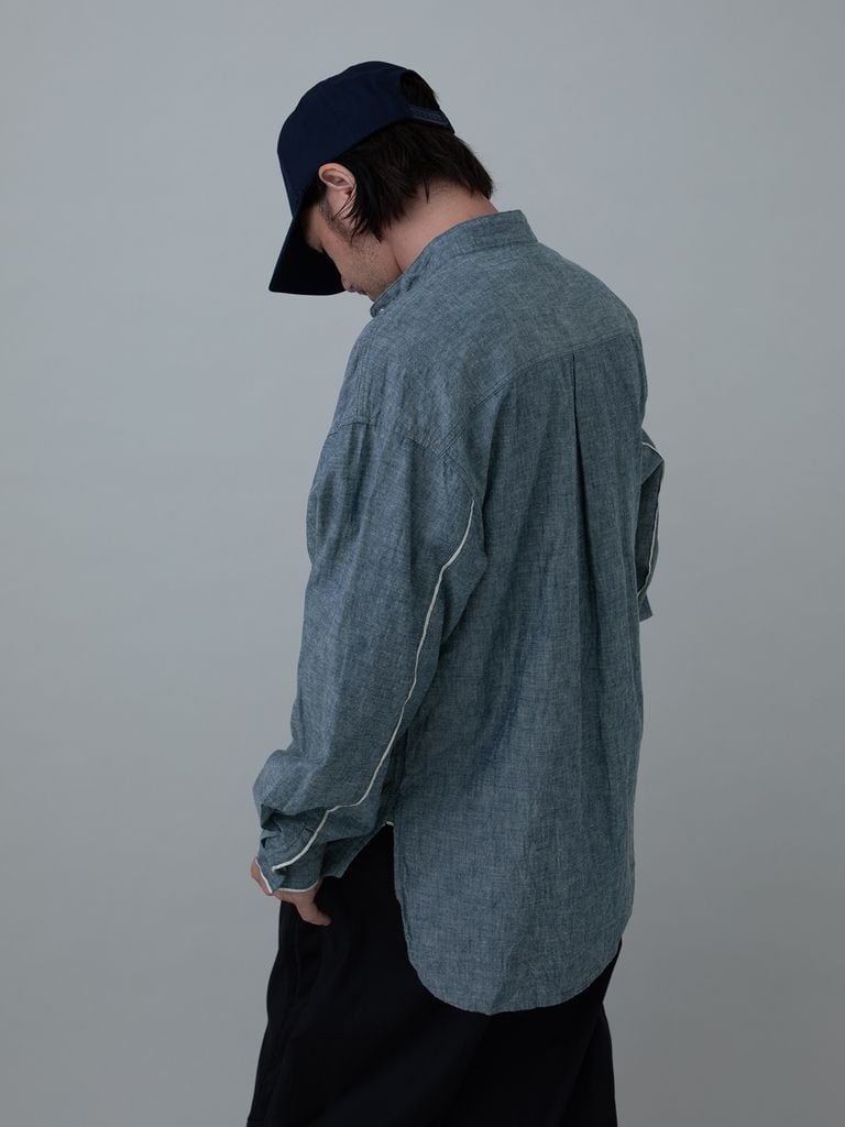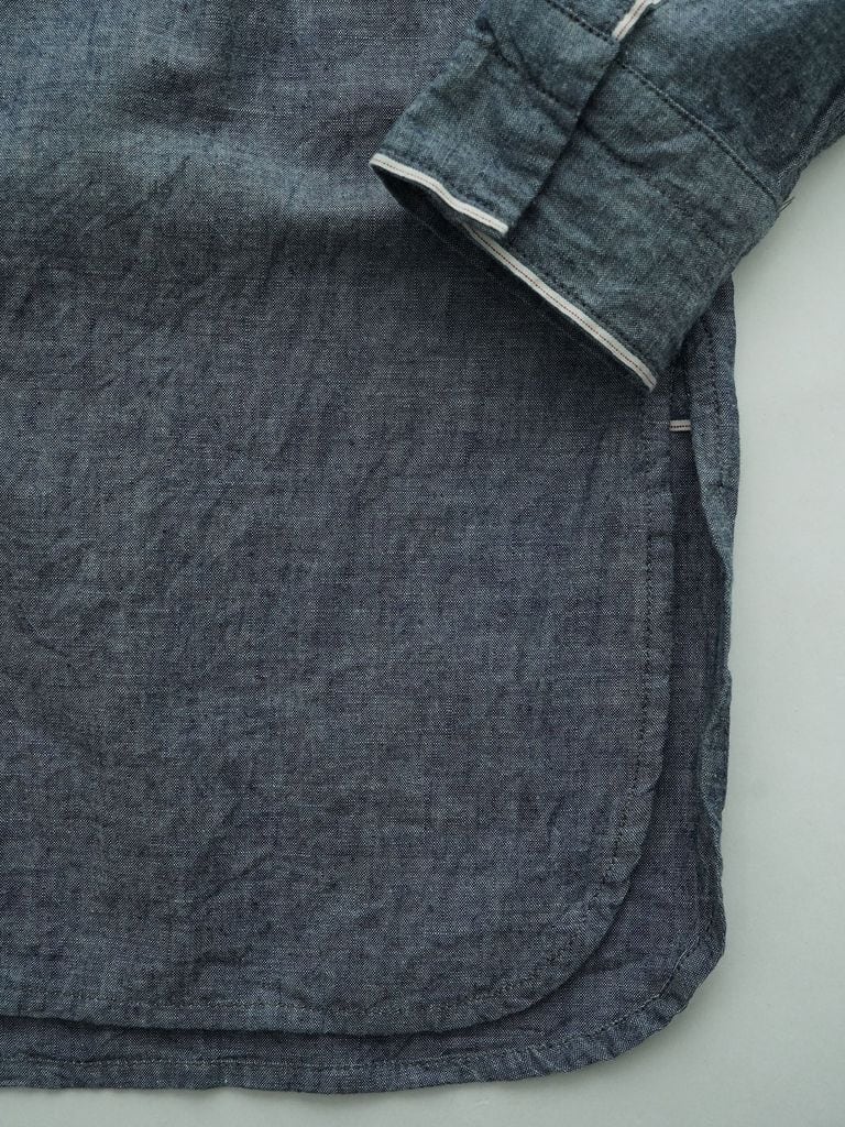 ミリタリーのオフィサーシャツをベースに、赤ミミのある素材を使用してワークシャツ風にミックスしたデザイン。