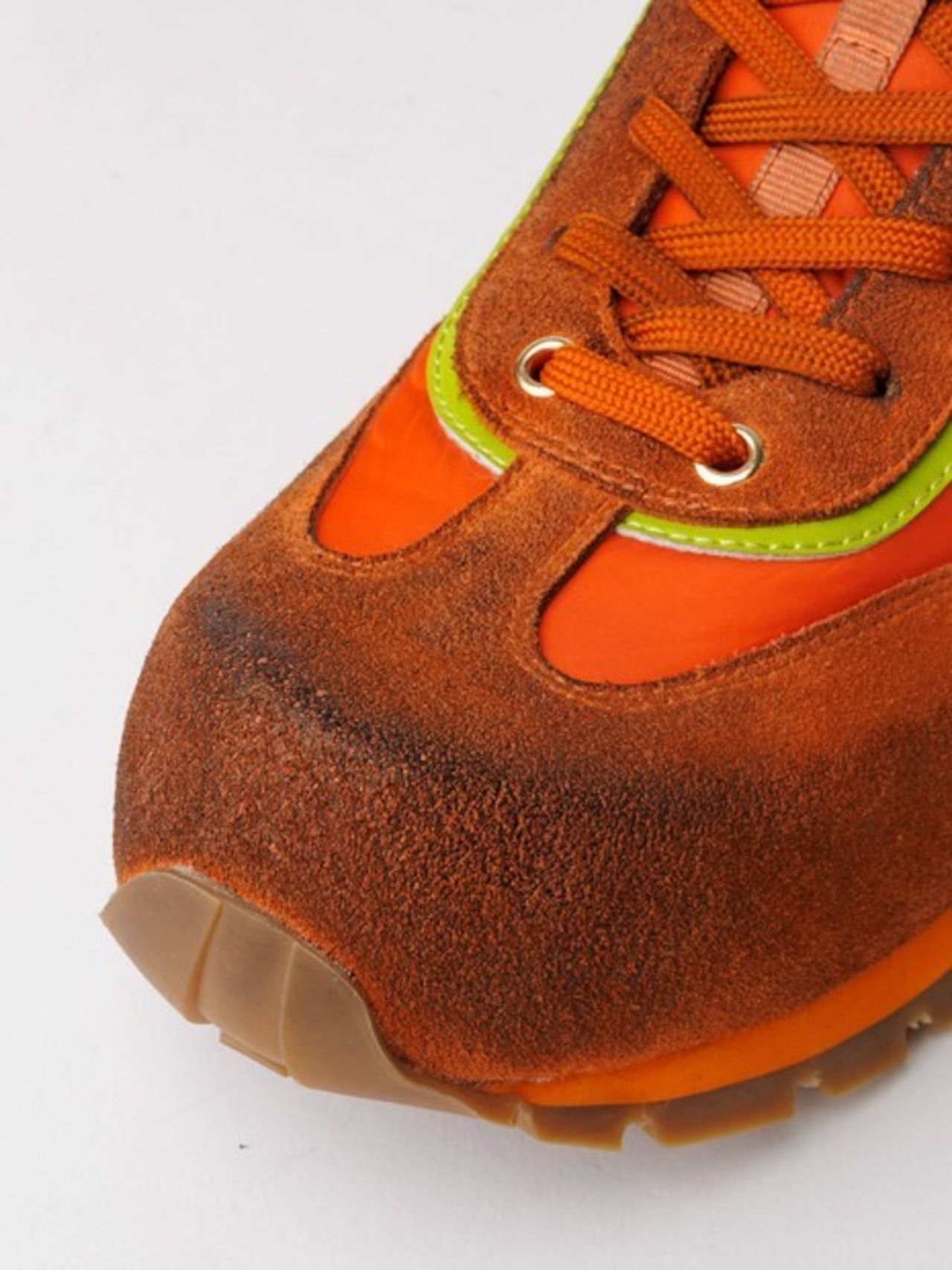 配色や素材使い、仕上げのヴィンテージ加工など細部にまでこだわった古着ライクなオリジナリティ溢れる他に類のない一足に。