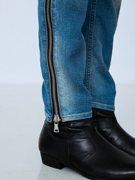 デザインは、定番5ポケットのスキニーパンツをベースに、存在感あるメタルジッパーを両サイドに走らせた唯一無二のデザイン。
