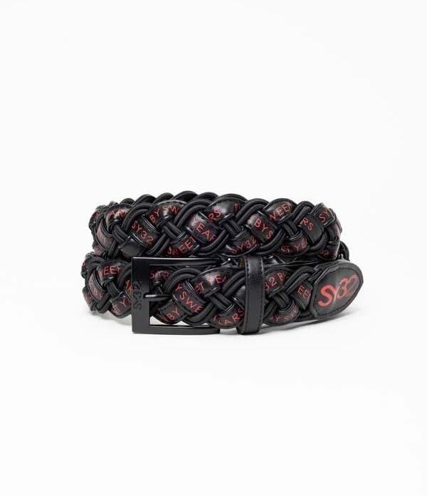 ブランドロゴがちりばめられ編みこみデザインのレザーベルト。