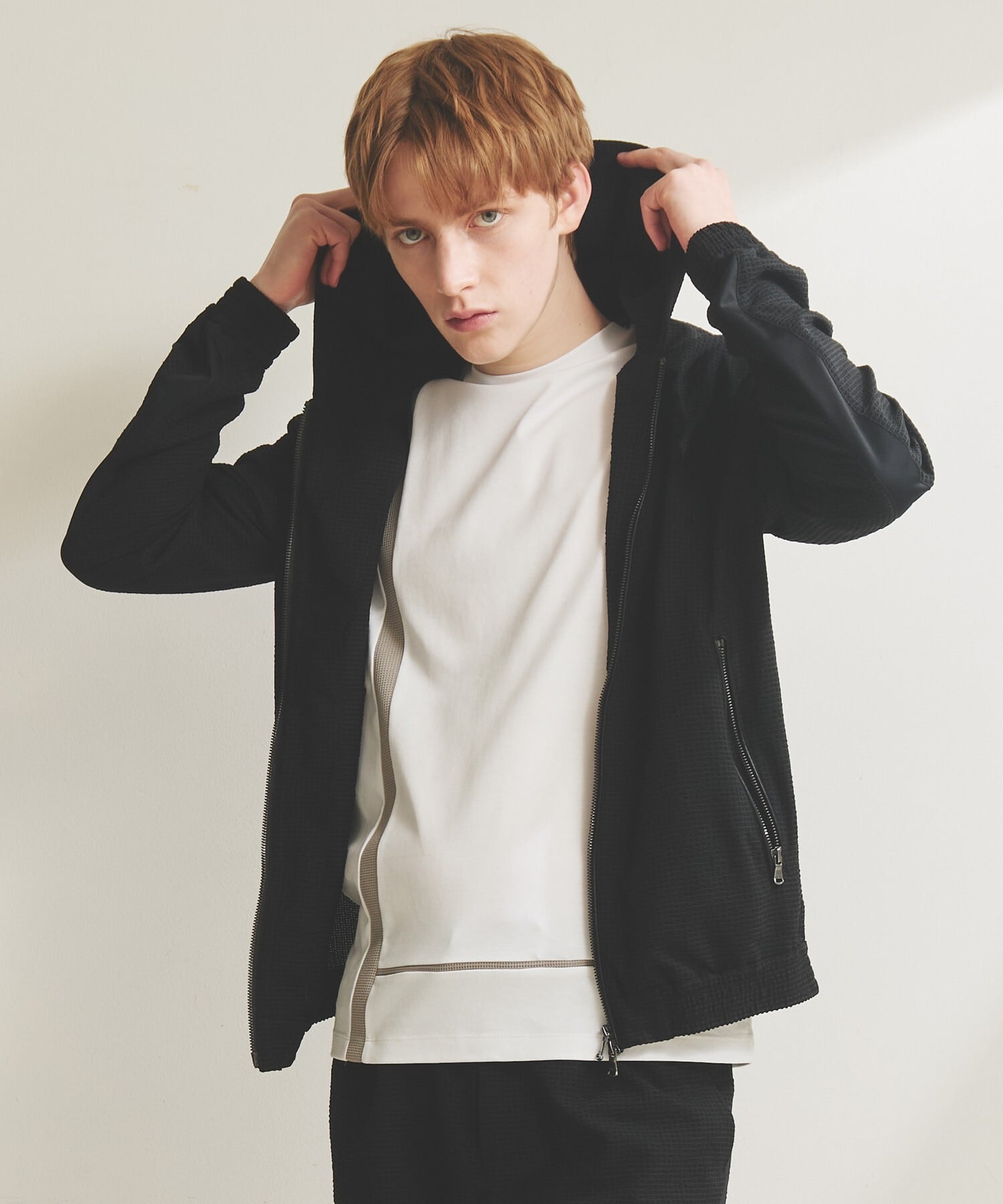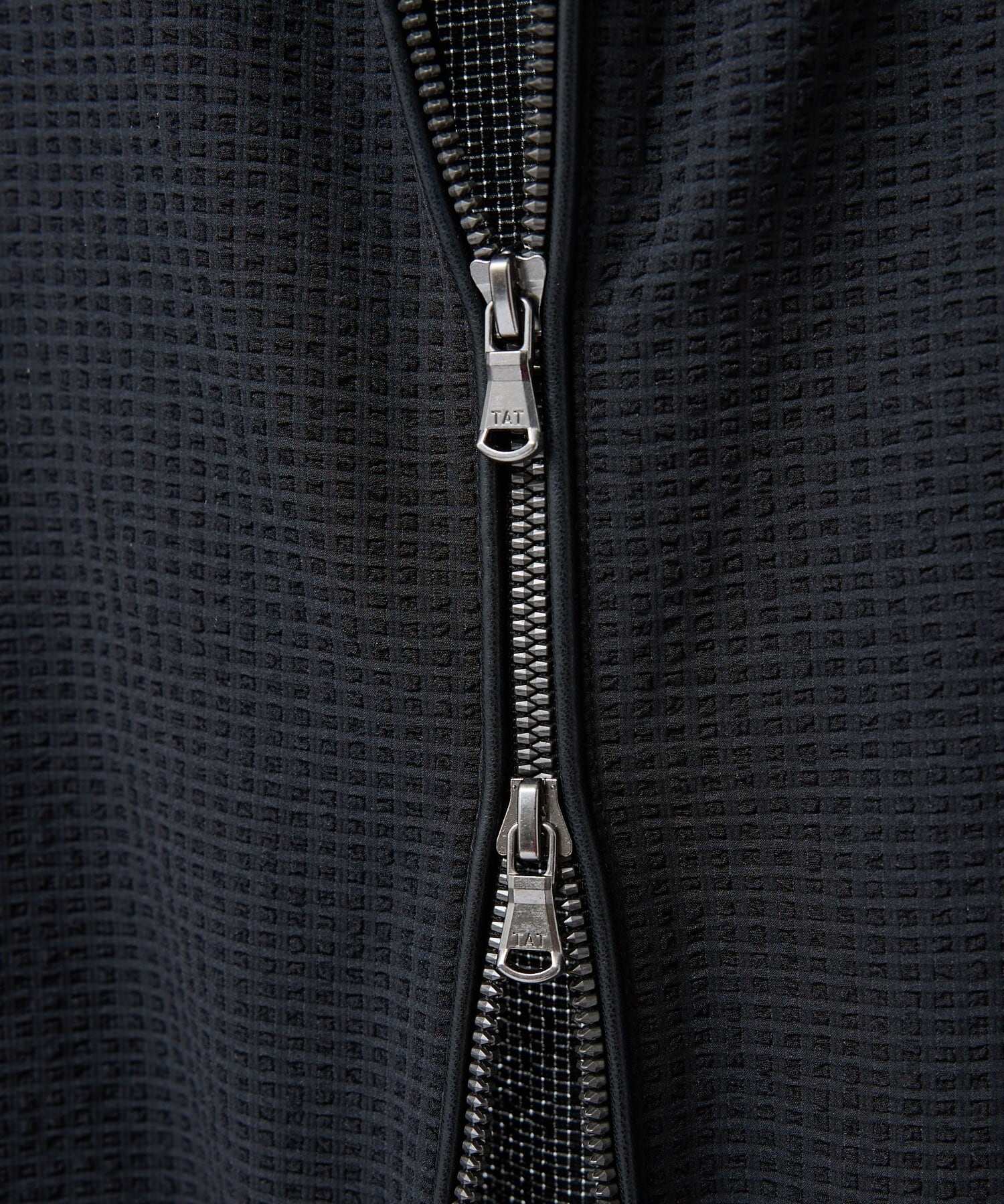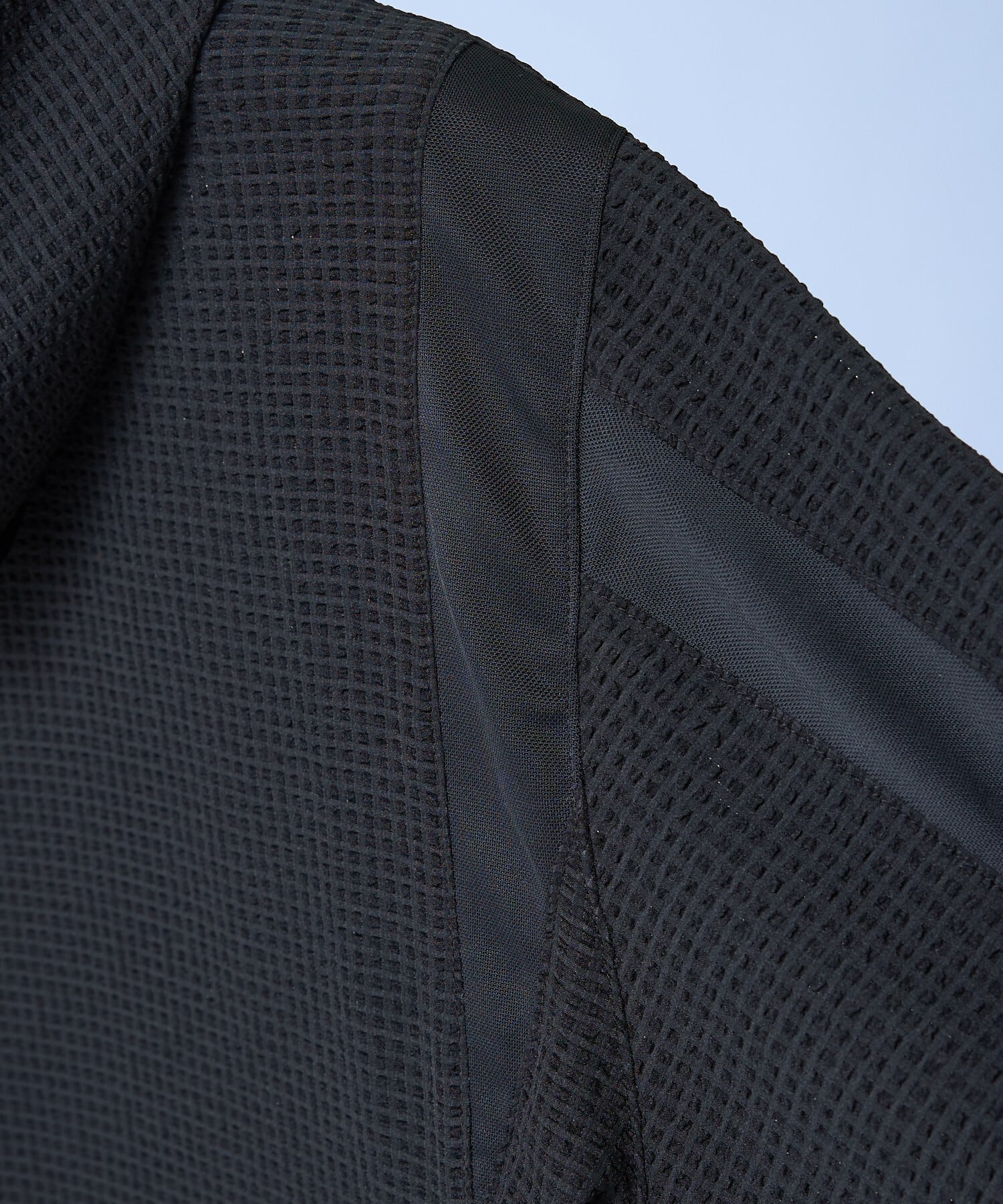 通気性と速乾性に優れた軽量ストレッチ素材で、ワッフル調の織りが奥行きのある表情を演出。